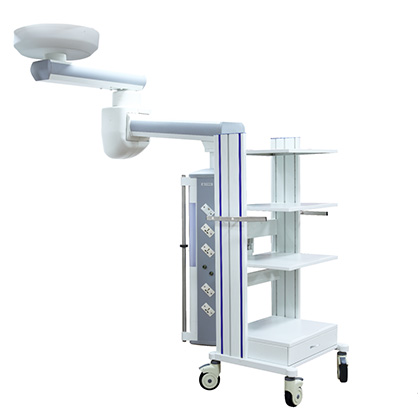 腔鏡吊塔用于承載內窺鏡、氣腹機、電刀、刻錄機、顯示器等設備,為其快速移動提供便利。同時腔鏡吊塔為設備提供氣源、電源、數據通訊接口、視頻接口,配備纜線及管路,使得設備和纜線管理井然有序,以改善工作流程,提升工作環境。由于承載的設備較多,腔鏡塔均為承重能力較強的重型塔,配有多層大尺寸的儀器平臺,有足夠的電源和數據傳輸終端,均配有機械阻尼和氣體雙重制動裝置。